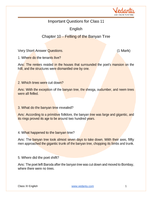 1. What are the most important expected questions from Felling of the Banyan Tree for CBSE Class 11 English board exams 2025–26?