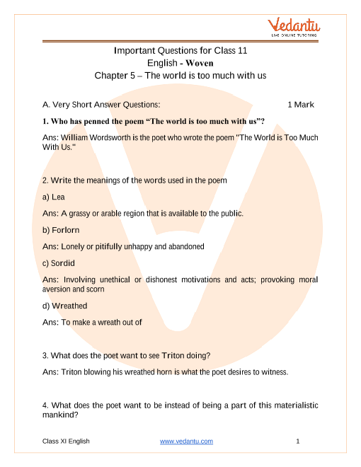 1. What are the most important questions from Class 11 English "The World Is Too Much With Us" for CBSE 2025–26?