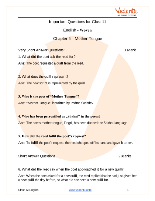 6. List some expected 1-mark frequently asked questions from 'Mother Tongue' Class 11 English Chapter 6.