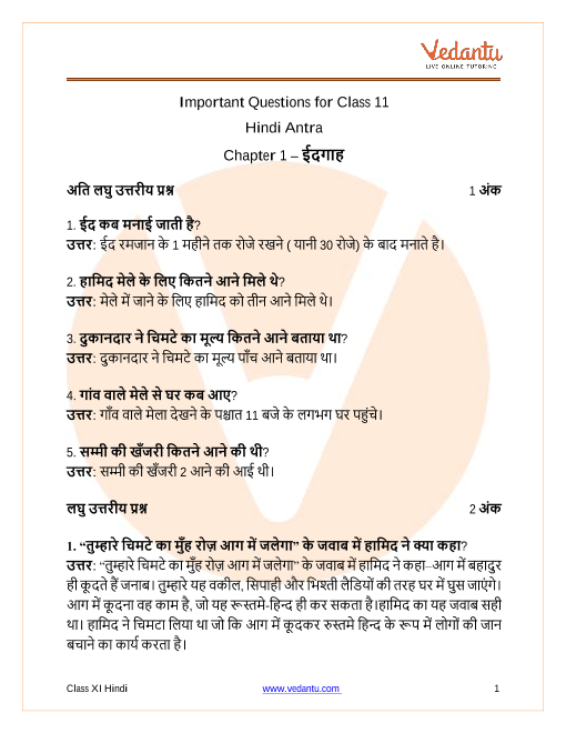 FAQs on CBSE Important Questions for Class 11 Hindi Antra Idgah - 2025-26