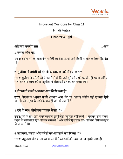 1. What are the most important questions likely to appear from CBSE Class 11 Hindi (Antra) Chapter 4 – Gunge in 2025-26 board exams?