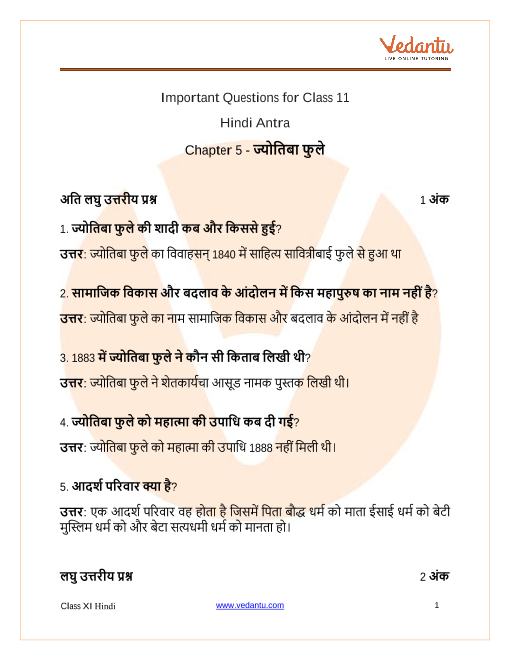 Focus on Phule's contributions, the social issues he addressed, and his role as a reformer. Practising with Vedantu’s Important Questions PDF is useful for targeted revision.