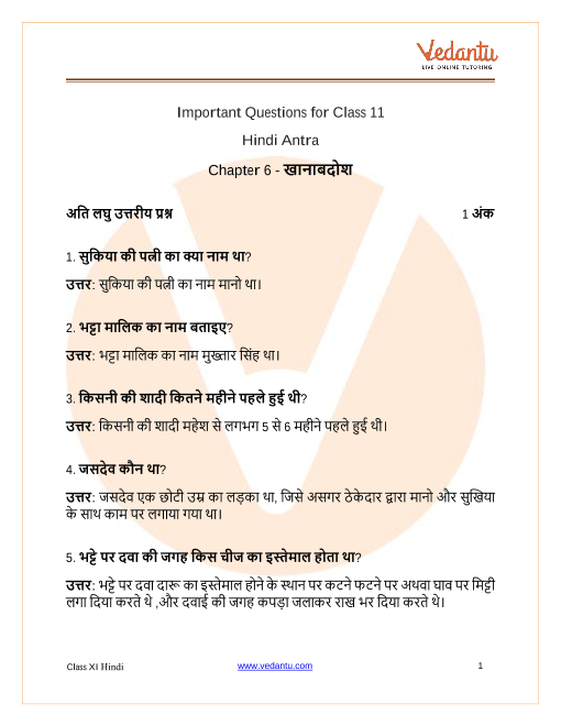 2. Which short answer questions from Khanabadosh are most expected for Class 11 Hindi exams?