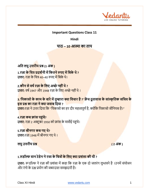 1. What are the most important 5-mark questions for CBSE Class 11 Hindi Chapter 10 – Aatma Ka Taap as per the 2025–26 board pattern?