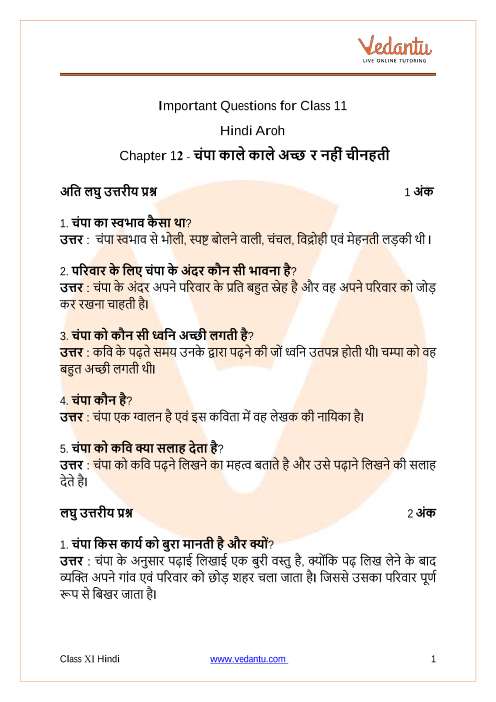 1. What are the most important questions for CBSE Class 11 Hindi Aroh Chapter 12 Poem "Champa Kale Kale Akshar Nehi Chinhati" as per the 2025-26 board exam pattern?