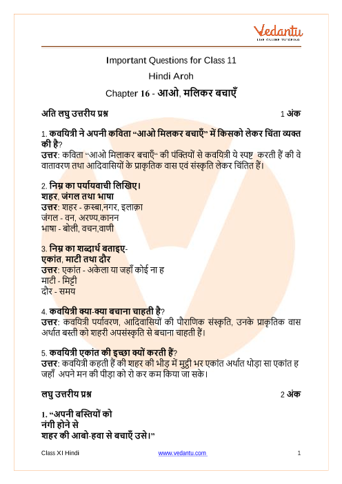 1. What are the most important expected questions from CBSE Class 11 Hindi Chapter 16 'Aao Milkar Bachaye' for 2025–26 exams?