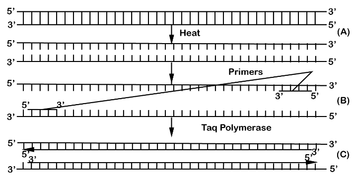 - Extension: Taq polymerase synthesizes new DNA strands at high temperature. Taq polymerase (from Thermus aquaticus) is heat-stable and allows for repeated cycles without enzyme degradation.