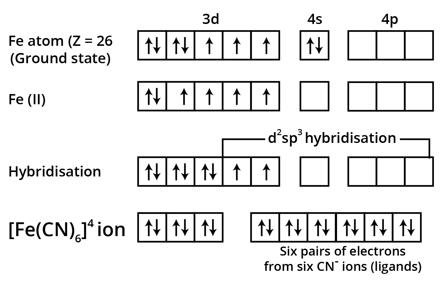 "Explain, with electronic configurations, why [Fe(CN)6]4– is diamagnetic while [FeF6]3– is paramagnetic, although both are octahedral."