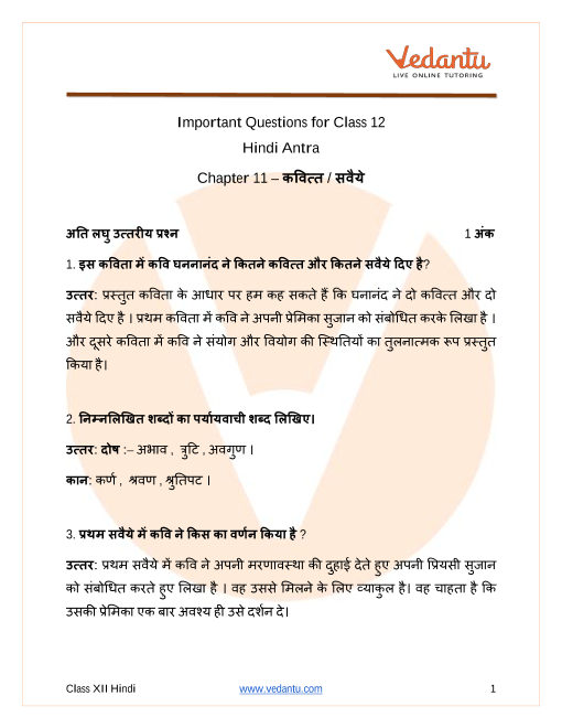 In the first Kavit, the poet wants to see his lover ‘Sujaan’. He says that he is alive just to see her once. In the second Kavit, the poet says to his lover why she is not interested in meeting him, why she is making excuses and why she is not listening to him. In the first Saveya, the poet tells the difference between separation and bonding. In the second Saveya, the poet tells that his lover had not read the love letter and had destroyed it. To know more students can download the vedantu app.