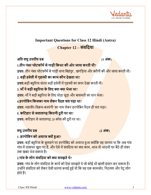 1. What are the most important questions from Class 12 Hindi (Antra) Chapter 12 'Samvadiya' for the 2025–26 CBSE board exams?