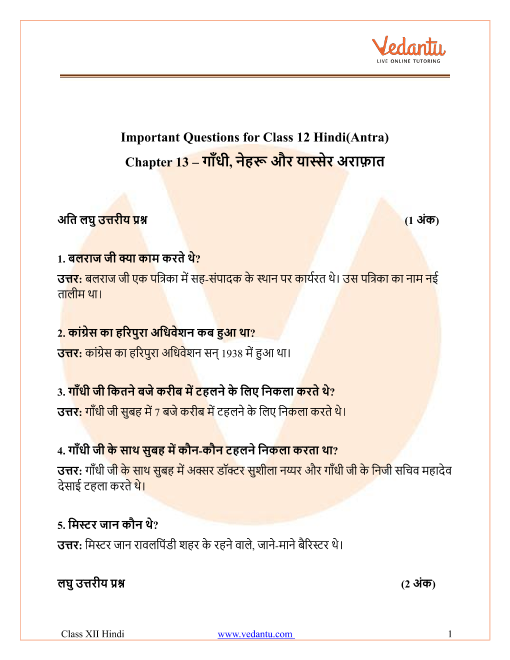 FAQs on CBSE Important Questions for Class 12 Hindi Antra गांधी, नेहरू और यास्सेर अराफ़ात - 2025-26