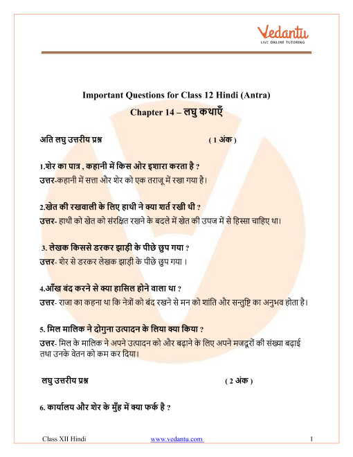 1. What are the most important questions likely to come from CBSE Class 12 Hindi Antra Chapter 14 - Laghu Kathaye in the 2025–26 board exams?