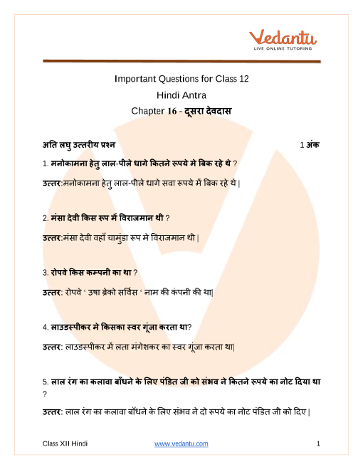 - As per the CBSE 2025–26 syllabus, important questions focus on character analysis (e.g. possible outcomes for 'Samabhav' and 'Paro'), themes like love and destiny, and evaluation of the title's relevance. Practice questions include 1-mark factuals (e.g., details about Mansa Devi Temple), 2–3 mark conceptuals (e.g., describe the significance of the Ganga aarti), and 5-mark analytical (e.g., discuss how 'Dusra Devdas' is a symbolic title).