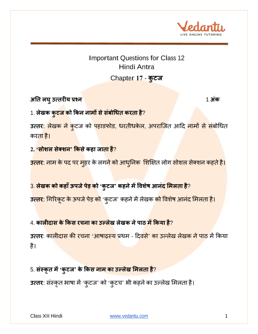 1. What are the most important questions expected from CBSE Class 12 Hindi Antra Chapter 17 Kutaj for the 2025–26 board exams?