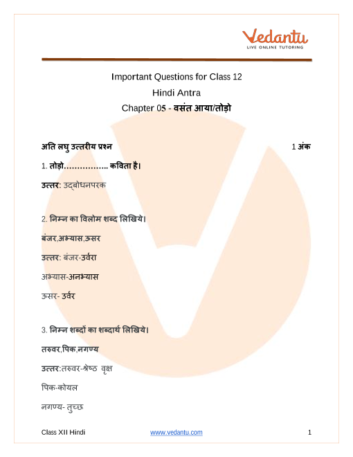10. ‘वसंत आया, तोड़ो’ की परीक्षा तैयारी हेतु Vedantu के Important Questions क्यों जरूरी हैं? (Application-based, 2025-26)