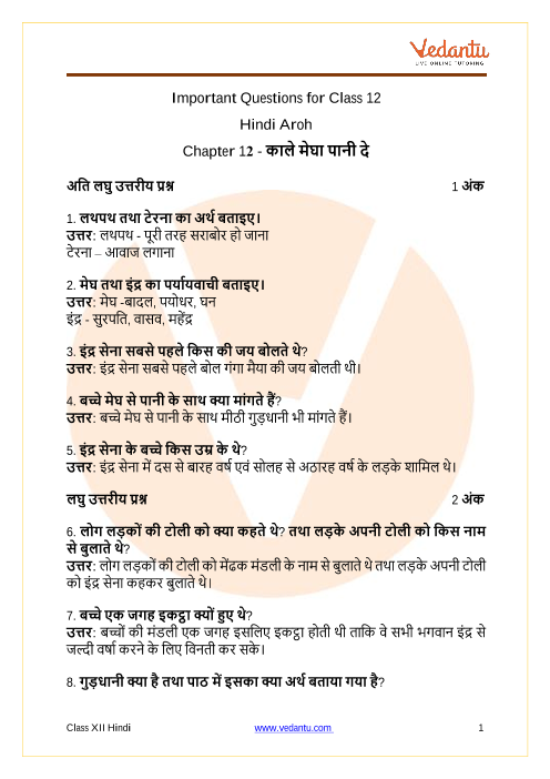 FAQs on CBSE Important Questions for Class 12 Hindi Aroh Kaale Megha Paani De - 2025-26