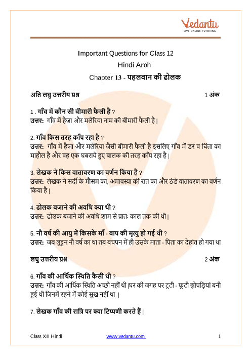 1. CBSE Class 12 Hindi Aroh Chapter 13 Pahelwan Ki Dholak ke liye 2025-26 kaun se important 1-mark questions board par sabse jyada pooche ja sakte hai?