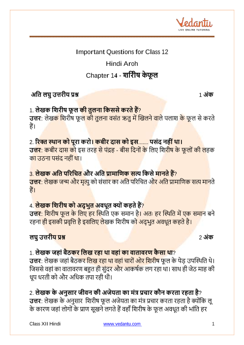 Shirish Ke Phool Class 12 important questions with answers PDF download