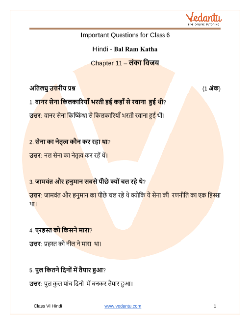 FAQs on CBSE Important Questions for Class 6 Hindi Bal Ram Katha Lanka Vijay - 2025-26