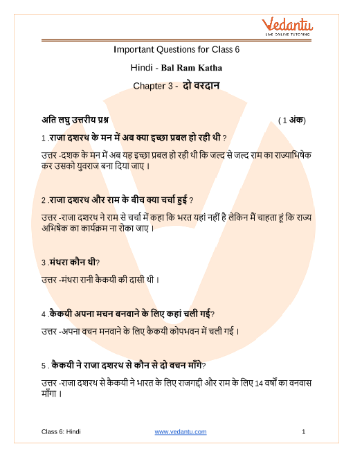 FAQs on CBSE Important Questions for Class 6 Hindi Bal Ram Katha Do Vardaan - 2025-26