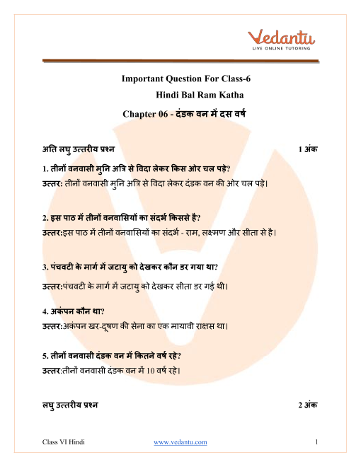 Study Important Question Class-6 Hindi Bal Ram Katha Chapter - 6 दंडक वन में दस वर्ष