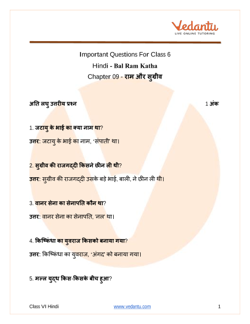 Study Important Question Class 6 Hindi Bal Ram Katha पाठ ९ - राम और सुग्रीव