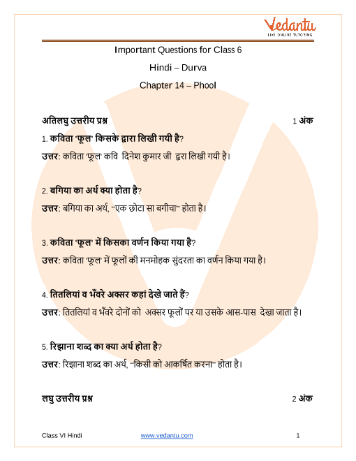 An Overview of Important Questions Class 6 Hindi Durva Chapter 14