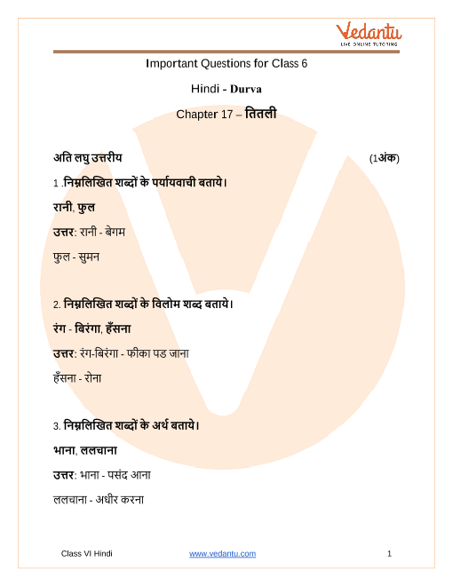 Important Questions Class 6 Hindi Durva Chapter 17