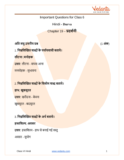 The important questions for CBSE Class 6 Hindi Durva Chapter 19 - Pradarshini provided by Vedantu, is completely based on the CBSE textbook. Students are advised to focus more on the important questions but at the same time should not forget about other questions that may be asked in the exam apart from the important questions given so that they could answer every question asked in the exam which may not be a part of the important questions PDF.