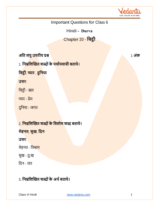 The important questions for CBSE Class 6 Hindi Durva Chapter 20 - Chitthi provided by Vedantu, is completely based on the CBSE textbook. Students are advised to focus more on the important questions but at the same time should not forget about other questions that may be asked in the exam apart from the important questions given so that they could answer every question asked in the exam which may not be a part of the important questions PDF.