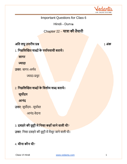 The important questions for CBSE Class 6 Hindi Durva Chapter 22 - Yatra Ki Taiyar provided by Vedantu, is completely based on the CBSE textbook. Students are advised to focus more on the important questions but at the same time should not forget about other questions that may be asked in the exam apart from the important questions given so that they could answer every question asked in the exam which may not be a part of the important questions PDF.