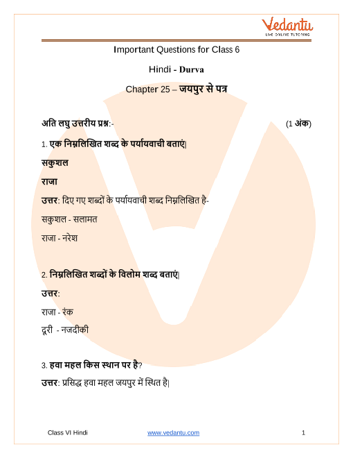 The important questions for CBSE Class 6 Hindi Durva Chapter 25 - Jaipur Se Patra provided by Vedantu, is completely based on the CBSE textbook. Students are advised to focus more on the important questions but at the same time should not forget about other questions that may be asked in the exam apart from the important questions given so that they could answer every question asked in the exam which may not be a part of the important questions PDF.