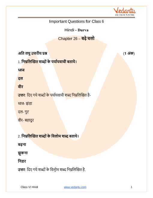 The important questions for CBSE Class 6 Hindi Durva Chapter 26 - Badhe Chalo provided by Vedantu, is completely based on the CBSE textbook. Students are advised to focus more on the important questions but at the same time should not forget about other questions that may be asked in the exam apart from the important questions given so that they could answer every question asked in the exam which may not be a part of the important questions PDF.