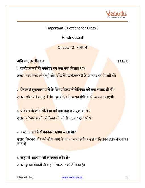 Vedantu requires a student to register on the platform to gain access to the Important Questions for Class 6 Hindi Vasant Chapter 2 - Bachpan, is a comprehensive study guide which includes Class 6 Hindi Chapter 2 important questions and Class 6 Hindi Vasant Chapter 2 extra questions. These questions are available on the Vedantu website in a PDF format and are readily available for download on any device.