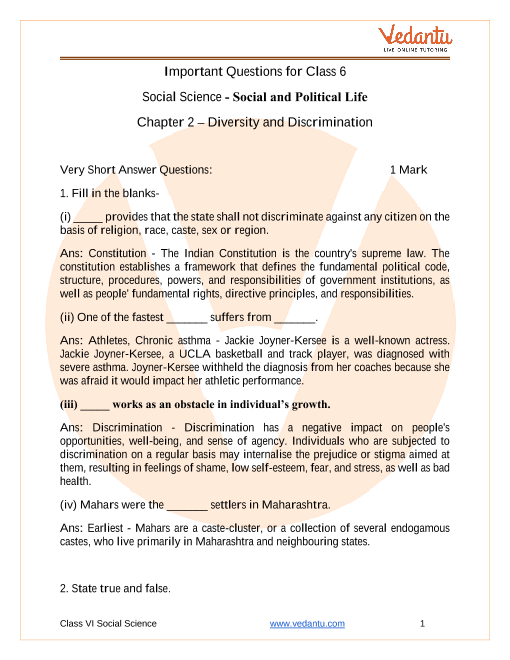Free PDF download of Important Questions with solutions for CBSE Class 6 Social Science - Social and Political Life Chapter 2 - Diversity and Discrimination prepared by expert Social Science teachers from latest edition of CBSE(NCERT) books. Register online for Social Science Social and Political Life tuition on Vedantu to score more marks in your examination.