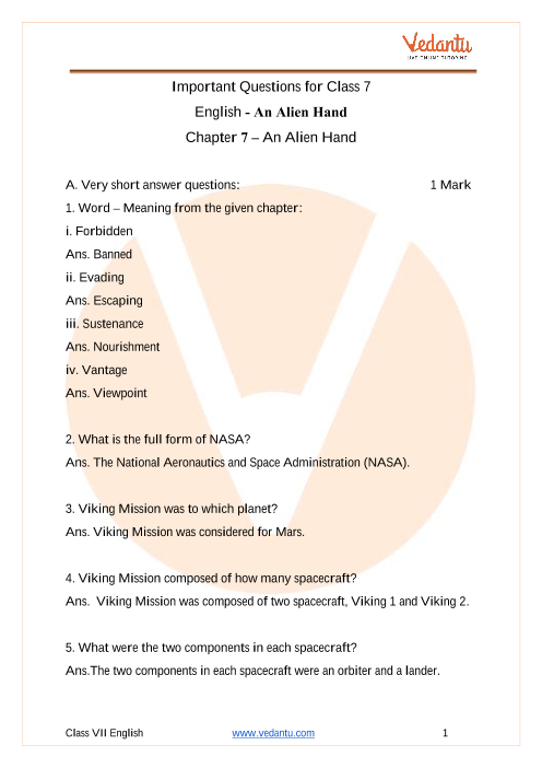 1. How does Vedantu’s Important Questions for Chapter 7 of Class 7th English “An Alien Hand” help students in forming perfect answers to questions in their exams?