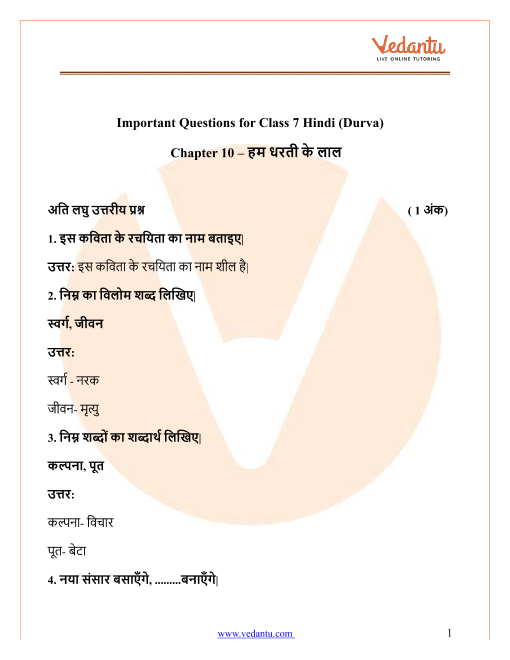 FAQs on Important Questions Class 7 Hindi Durva Chapter 10