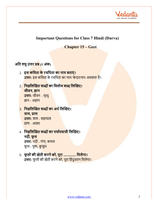4. Why should I choose Vedantu for Important Questions for CBSE Class 7 Hindi Durva Chapter 15 – Geet?
