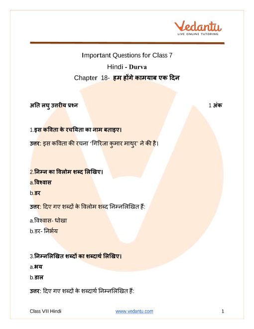 FAQs on Important Questions Class 7 Hindi Durva Chapter 18