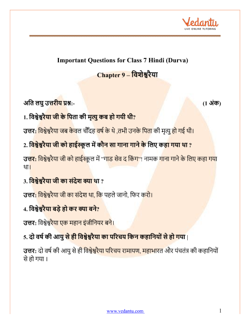 कक्षा 7 की परीक्षा के लिए 'विश्वेश्वरैया' पाठ से कुछ महत्वपूर्ण लघु उत्तरीय प्रश्न इस प्रकार हैं:
