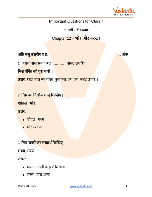 FAQs on CBSE Important Questions for Class 7 Hindi Vasant Bhor Aur Barkha - 2025-26