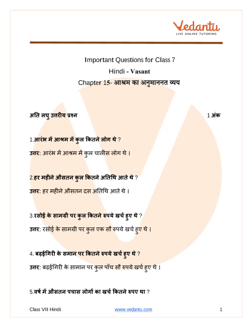 FAQs on CBSE Important Questions for Class 7 Hindi आश्रम का अनुमानित व्यय - 2025-26
