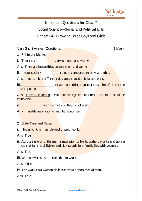 FAQs on CBSE Important Questions for Class 7 Social Science Growing Up As Boys And Girls - 2025-26