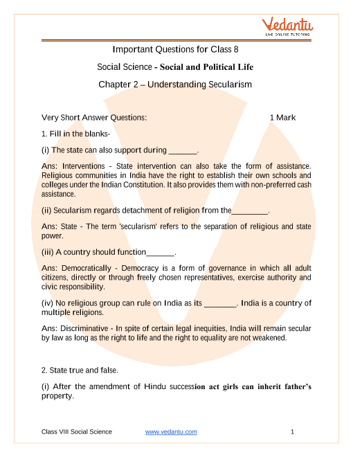FAQs on CBSE Important Questions for Class 8 Social Science Understanding Secularism - 2025-26