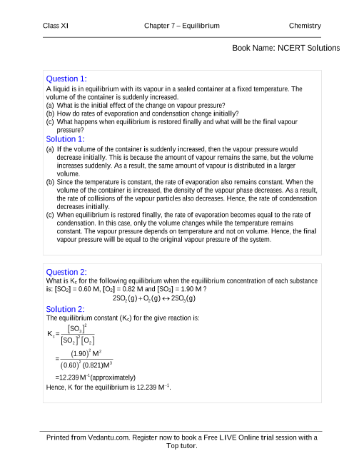 Students can download Class 11 Chemistry Chapter 7 Equilibrium along with the entire NCERT textbook at the official website. The NCERT textbook will help students get a vivid understanding of the various topics mentioned as part of the Class 11 syllabus. They are also incorporated with several sets of exercise questions from each chapter which the students are advised to try working out. They give an idea of how questions usually come from a particular chapter and what to expect for the exam. On this page, Students can download Class 11 Chemistry Chapter-7 PDF Solutions of the NCERT book. This will help students with getting the right solutions to each question and will let students know how to answer them in such a way as to get maximum marks.
