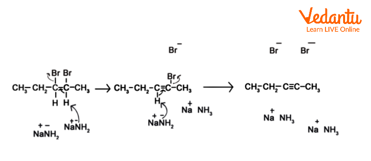 The mechanism of a reaction between 2,3-dibromopentane and sodium amide in liquid ammonia is depicted here, where liquid ammonia does not participate in the reaction but is employed as a solvent.