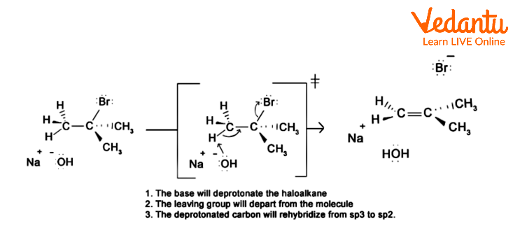 As a result of this combination, the E2 mechanism produces the bulk of the product. Remember that the E2 process is a coordinated response (occurs in 1 step). However, the molecule undergoes three distinct transformations in one single process. This is the result of the reaction between 2-bromo-2-methylpropane with sodium hydroxide.