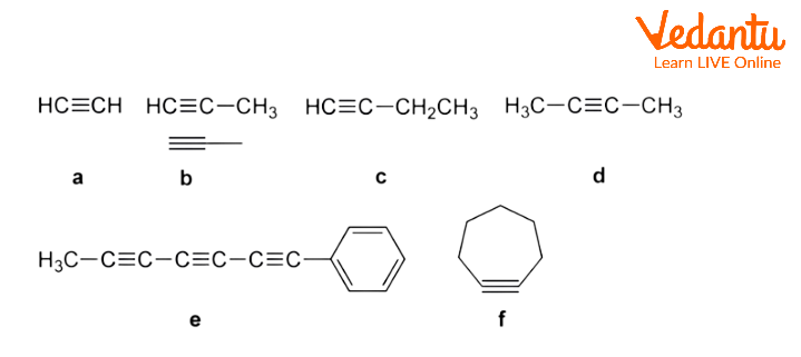 acetylene, b, two representations of propyne, c, 1-butyne, d, 2-butyne, e, naturally occurring 1-phenylhepta-1,3,5-triyne, and f, strained cycloheptyne. Blue highlights triple bonds.