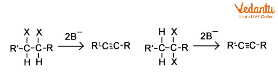 When we apply this notion to two halides on vicinal or geminal carbons, the E2 reaction occurs twice, resulting in the production of two pi bonds and an alkyne, as illustrated in the instances below, where the strong base is denoted by the letter B-.