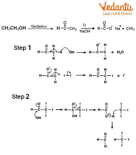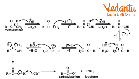 - Iodination: The enolate ion reacts with iodine (\( I_2 \)), replacing the hydrogens with iodines in three successive steps to yield a triiodinated compound (\( RCOCI_3 \)).